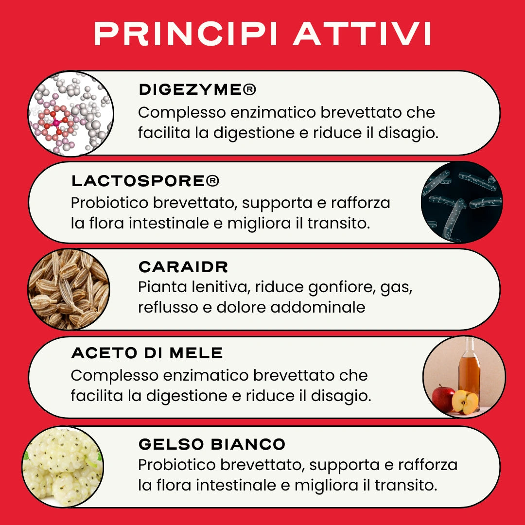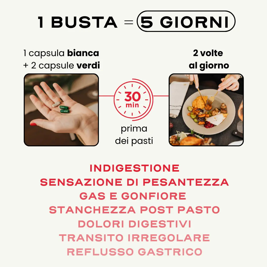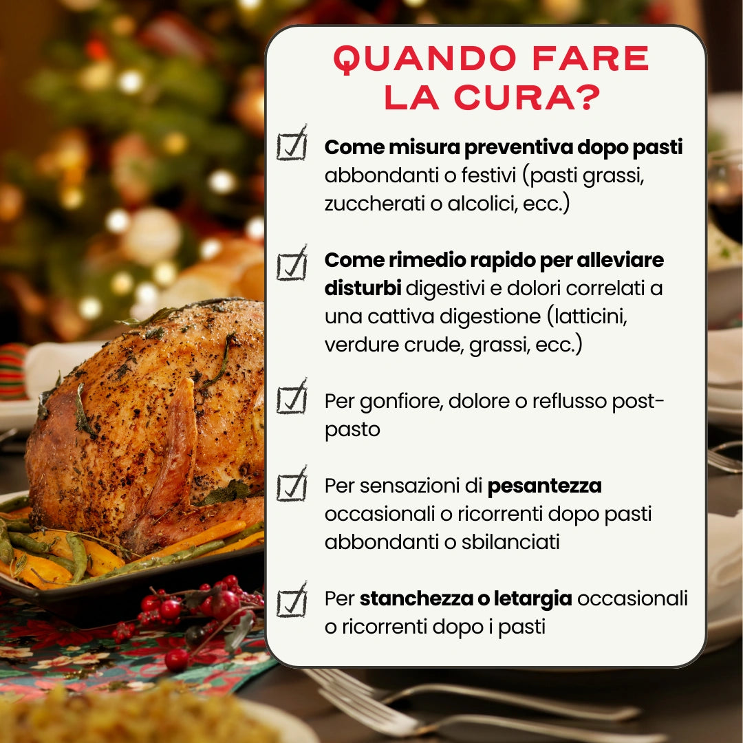 Pensata per affrontare meglio gli eccessi e i periodi festivi, alleviare gonfiore, fastidi digestivi, sensazione di pesantezza e stanchezza dopo i pasti.