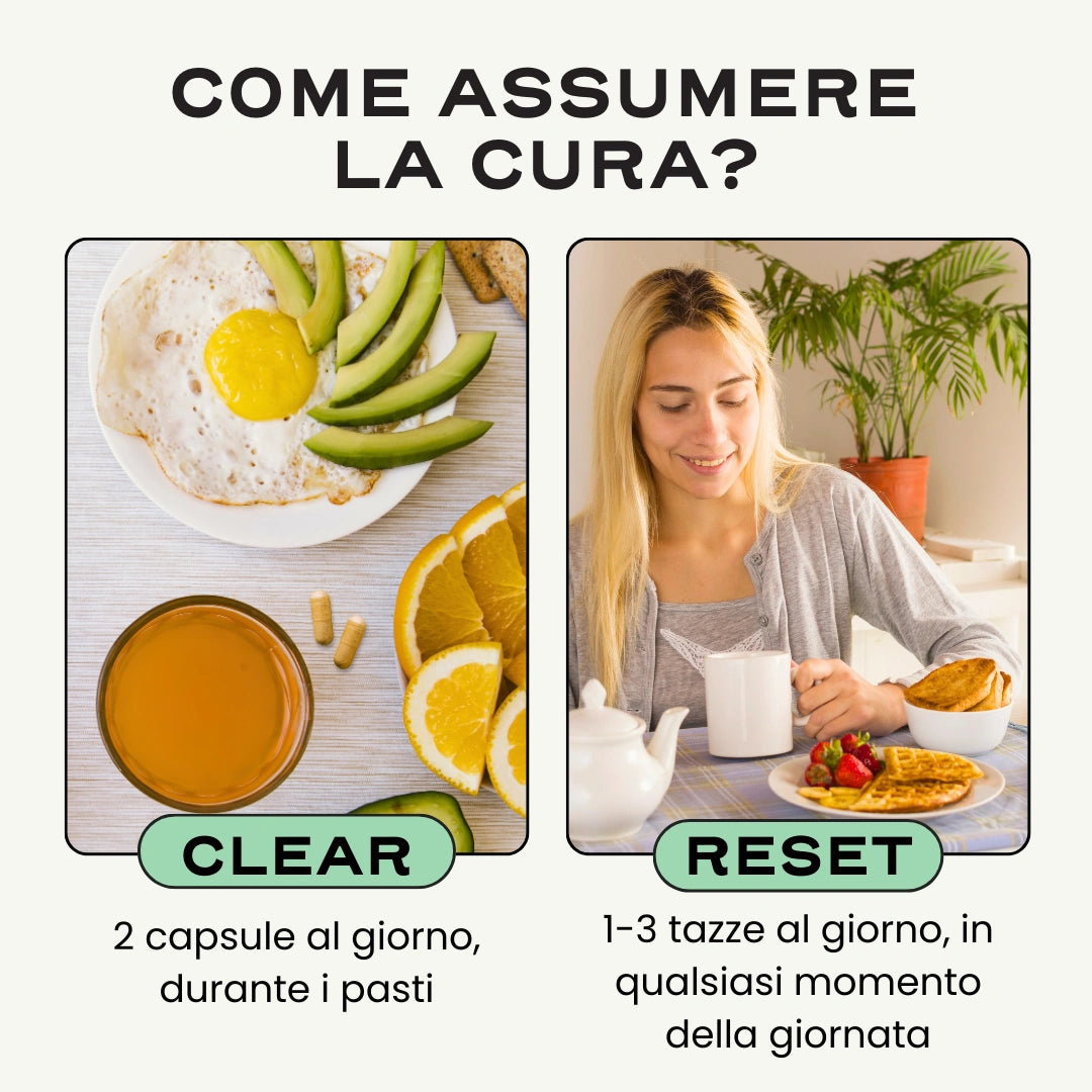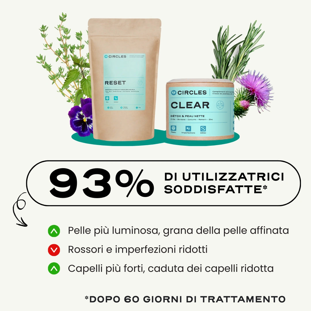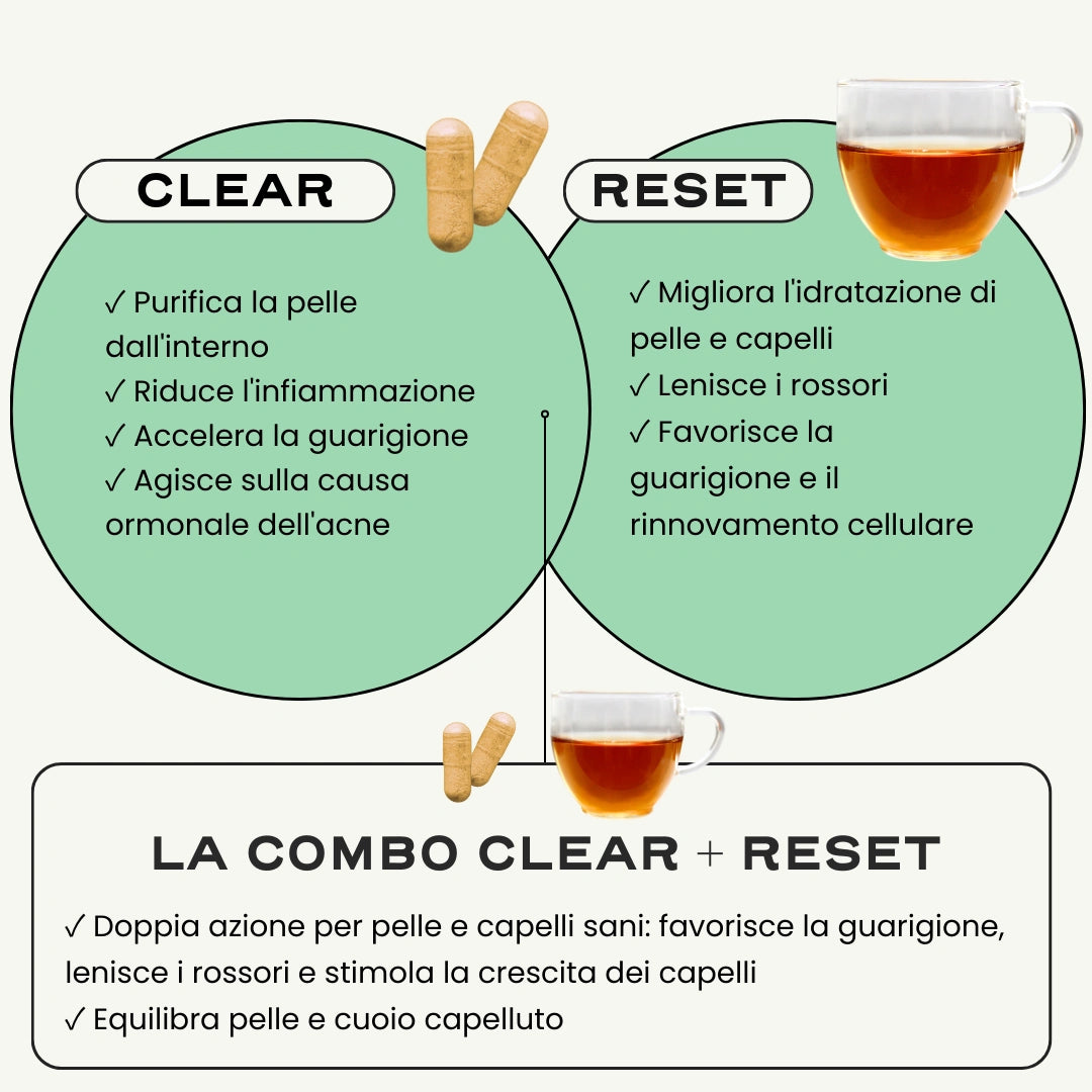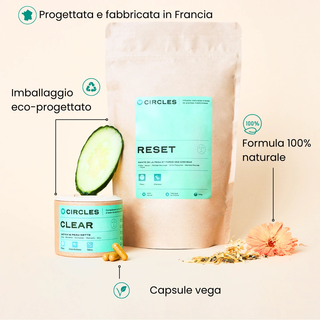 La combinazione delle nostre soluzioni CLEAR e RESET per supportare la disintossicazione dell'organismo e favorire l'equilibrio e la salute della pelle e dei capelli.