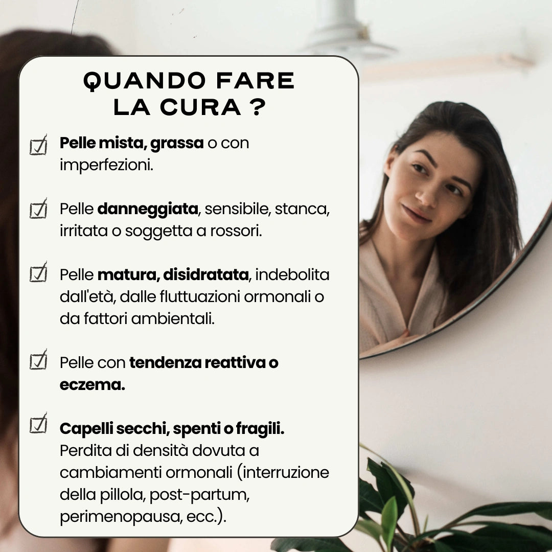 👩 In caso di problemi della pelle: acne ormonale localizzata sulla parte inferiore del viso, variazione della qualità della pelle legata al ciclo mestruale, problemi della pelle legati all'infiammazione...