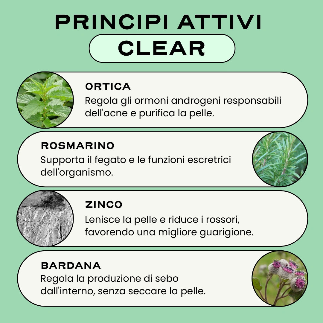 Il nostro integratore alimentare più venduto CLEAR è stato progettato per disintossicare il corpo dentro e fuori e supportare il riequilibrio degli ormoni. La pelle è luminosa e purificata, l'acne legata al ciclo diventa un lontano ricordo. Vengono regolati anche i segni di iperandrogenismo (perdita di capelli, aumento della crescita dei peli).