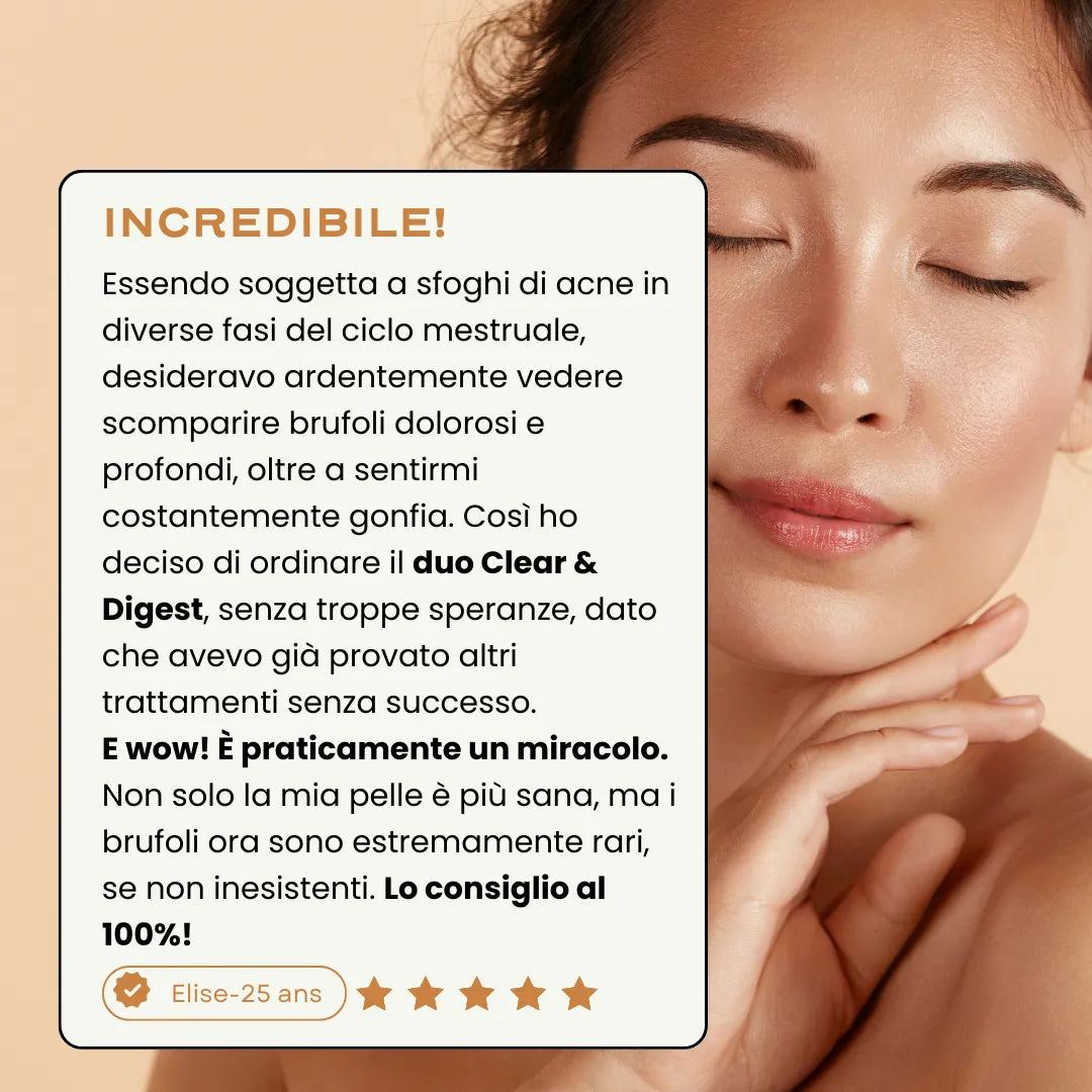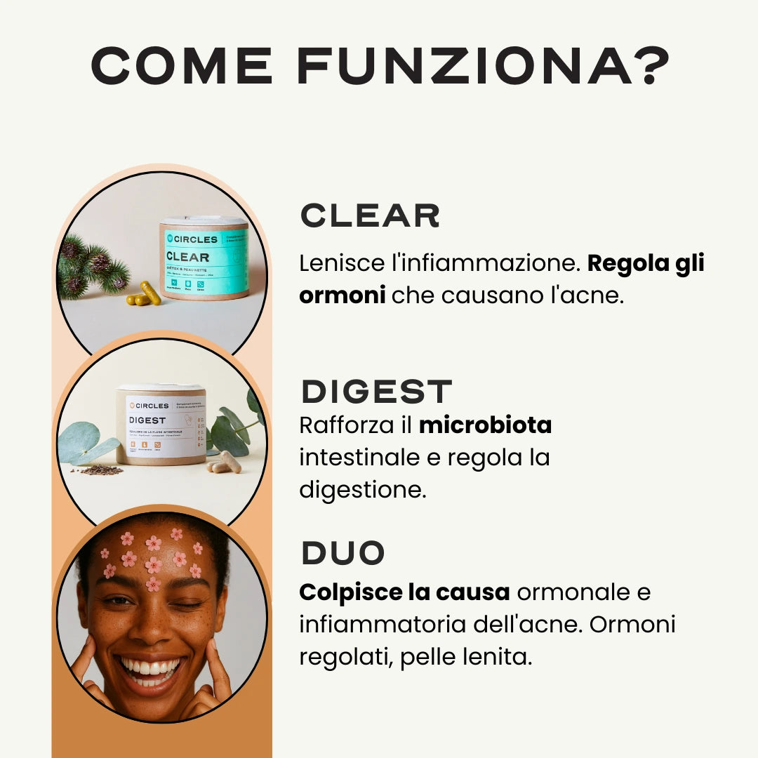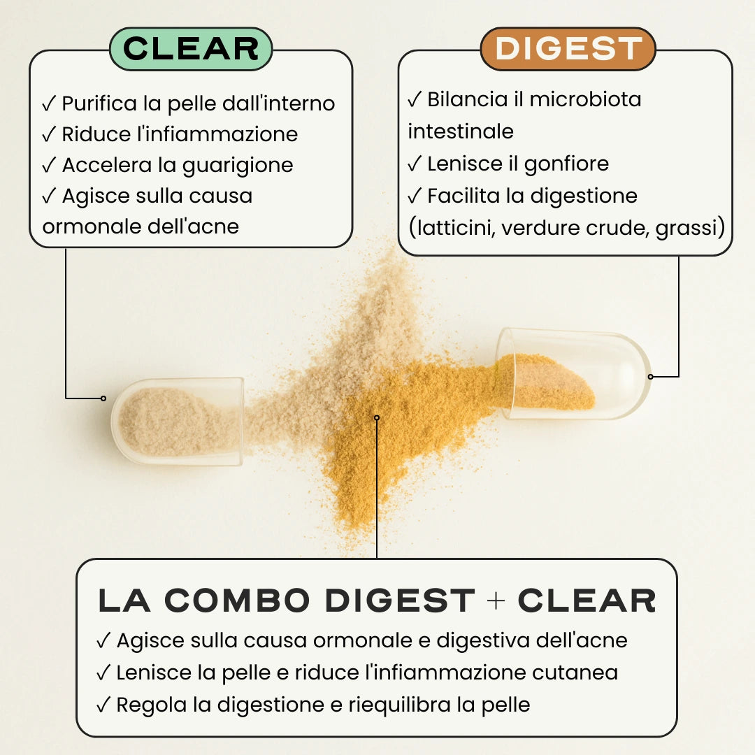 CLEAR e DIGEST lavorano in sinergia per agire sulle cause ormonali e digestive dell'acne e degli squilibri cutanei. Piante, enzimi digestivi e probiotici lavorano in simbiosi per contrastare l'infiammazione, favorire la digestione, aiutare l'organismo a eliminare le tossine e riequilibrare naturalmente il microbiota cutaneo e digestivo. La digestione viene regolata, il microbiota intestinale rafforzato e la pelle riequilibrata.