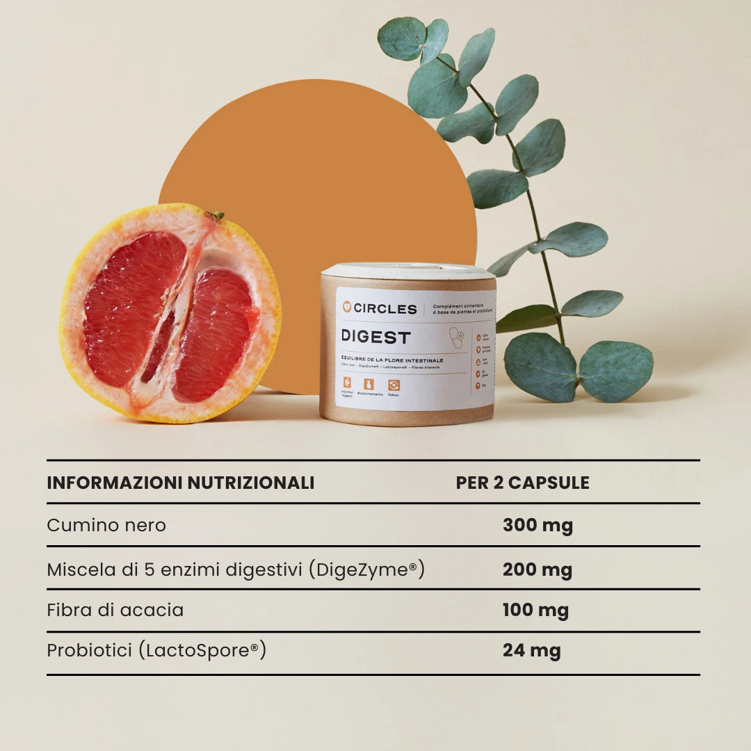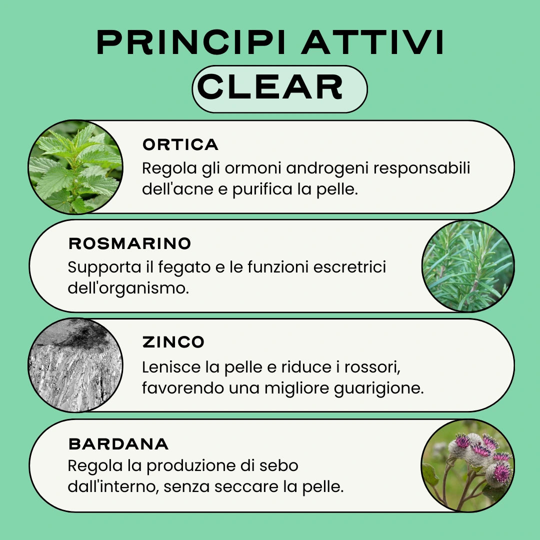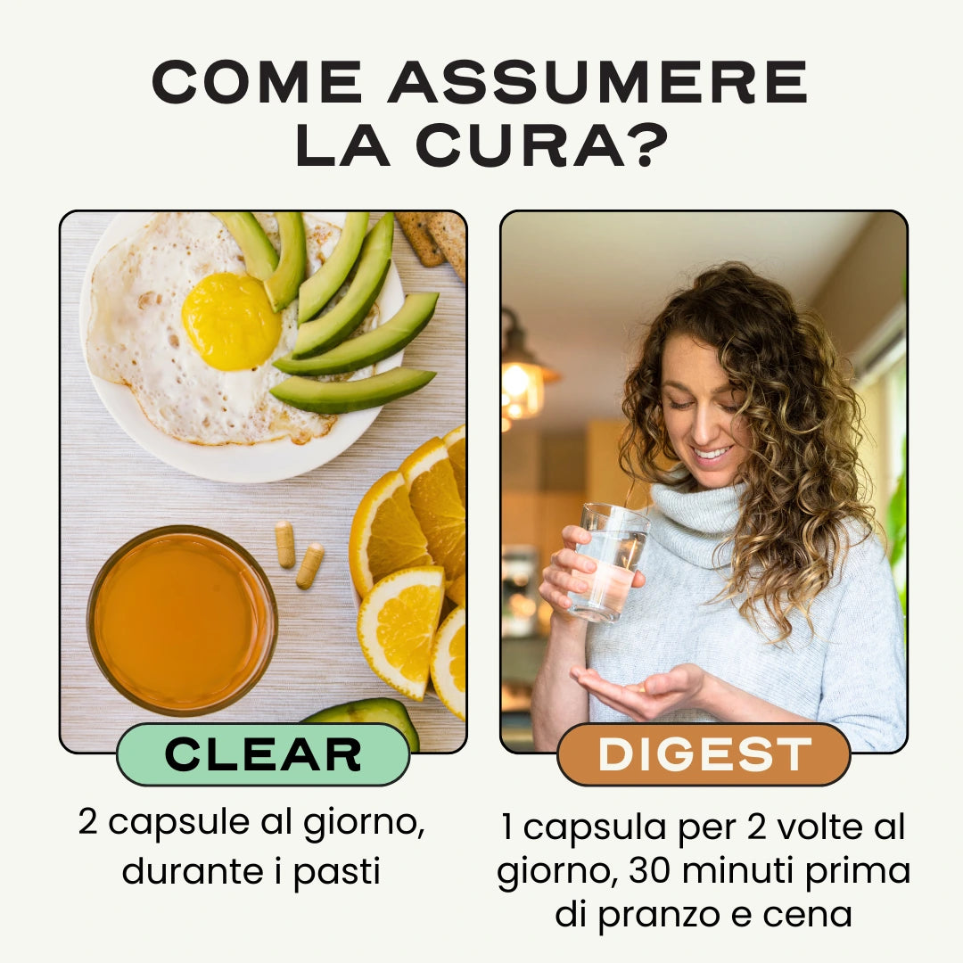 CLEAR e DIGEST lavorano in sinergia per agire sulle cause ormonali e digestive dell'acne e degli squilibri cutanei. Piante, enzimi digestivi e probiotici lavorano in simbiosi per contrastare l'infiammazione, favorire la digestione, aiutare l'organismo a eliminare le tossine e riequilibrare naturalmente il microbiota cutaneo e digestivo. La digestione viene regolata, il microbiota intestinale rafforzato e la pelle riequilibrata.