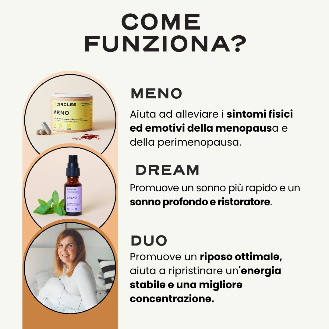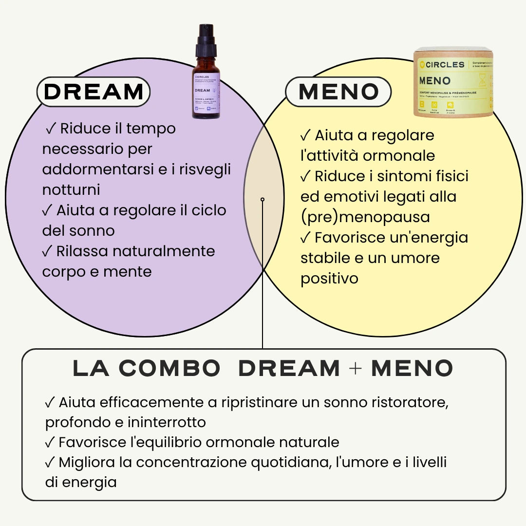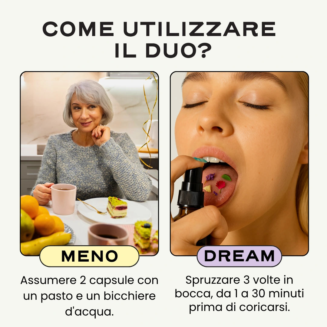 L'azione congiunta di DREAM, il nostro spray orale con melatonina e MENO, il nostro integratore per una menopausa più serena , aiuta a regolare l'umore, ad alleviare lo stress e l'ansia e a migliorare in modo duraturo la qualità del sonno. Il corpo e la mente si rasserenano, il riposo migliora, si ritrova l'energia.