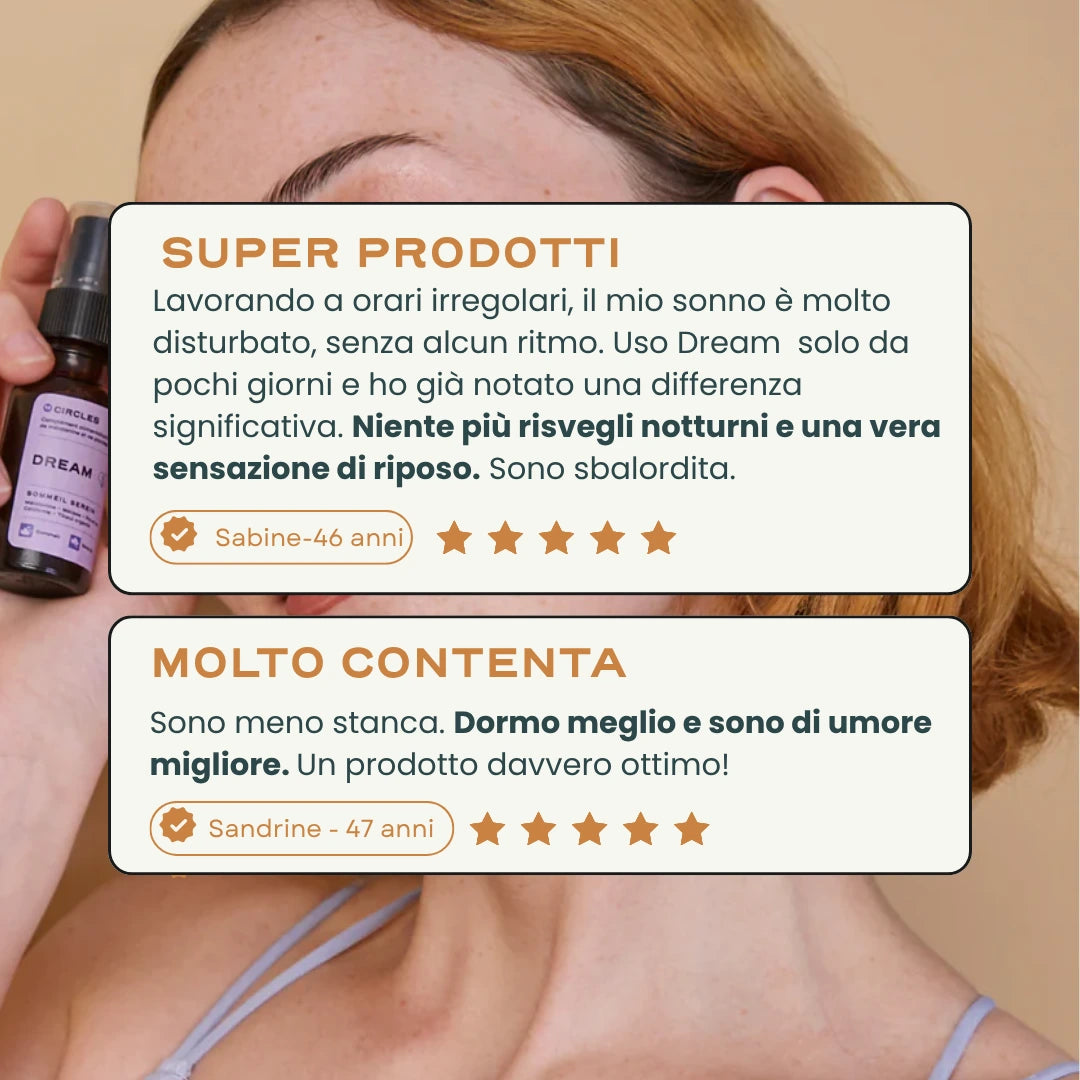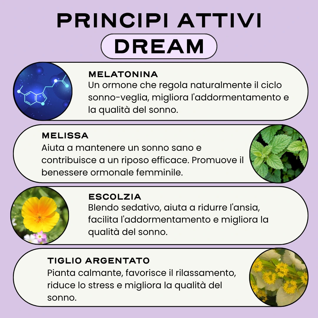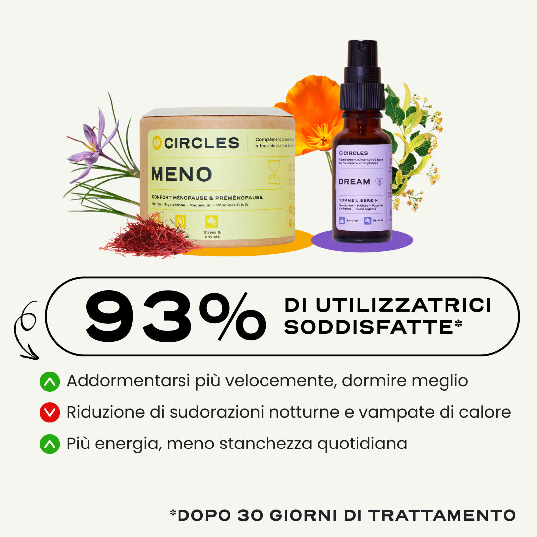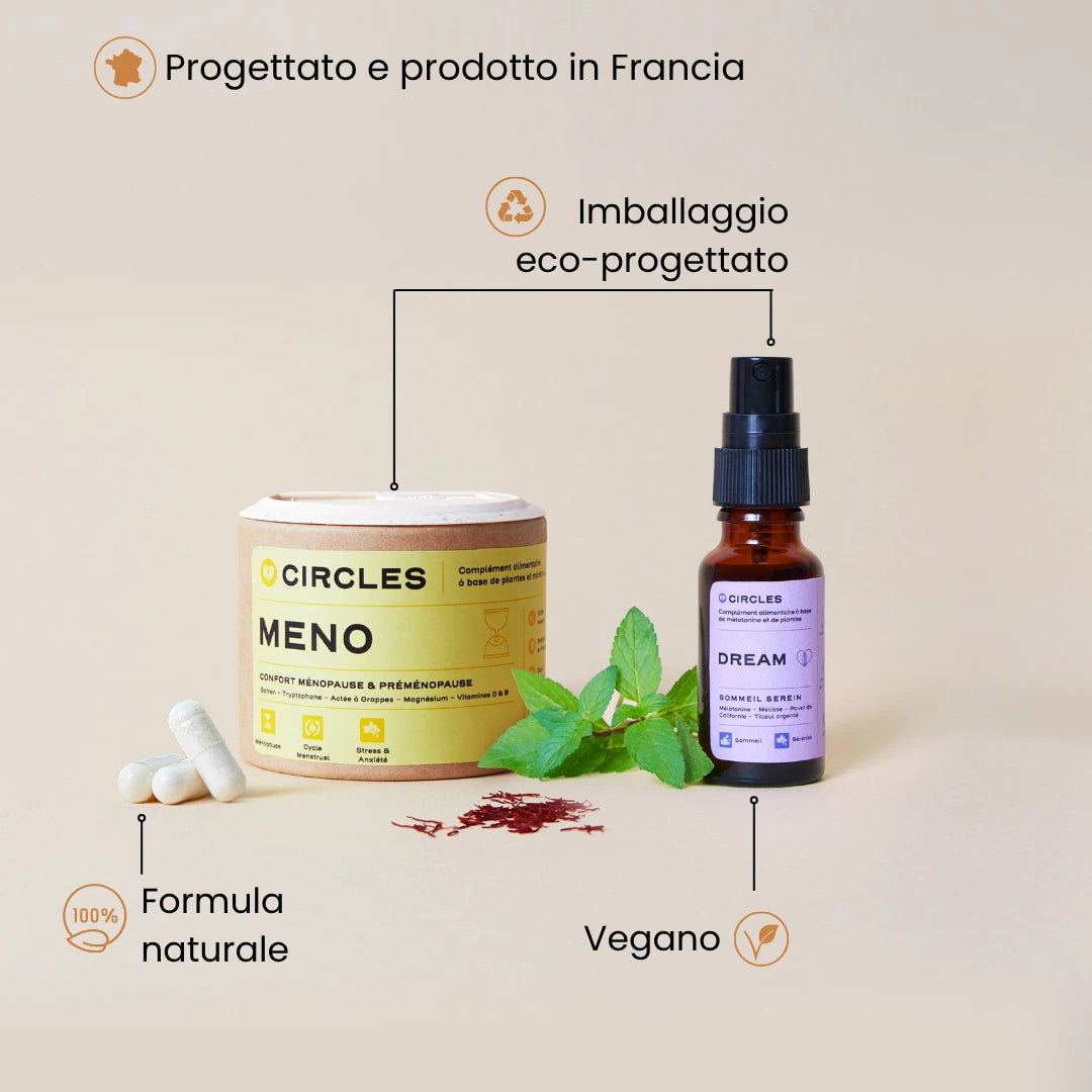 L'azione congiunta di DREAM, il nostro spray orale con melatonina e MENO, il nostro integratore per una menopausa più serena , aiuta a regolare l'umore, ad alleviare lo stress e l'ansia e a migliorare in modo duraturo la qualità del sonno. Il corpo e la mente si rasserenano, il riposo migliora, si ritrova l'energia.