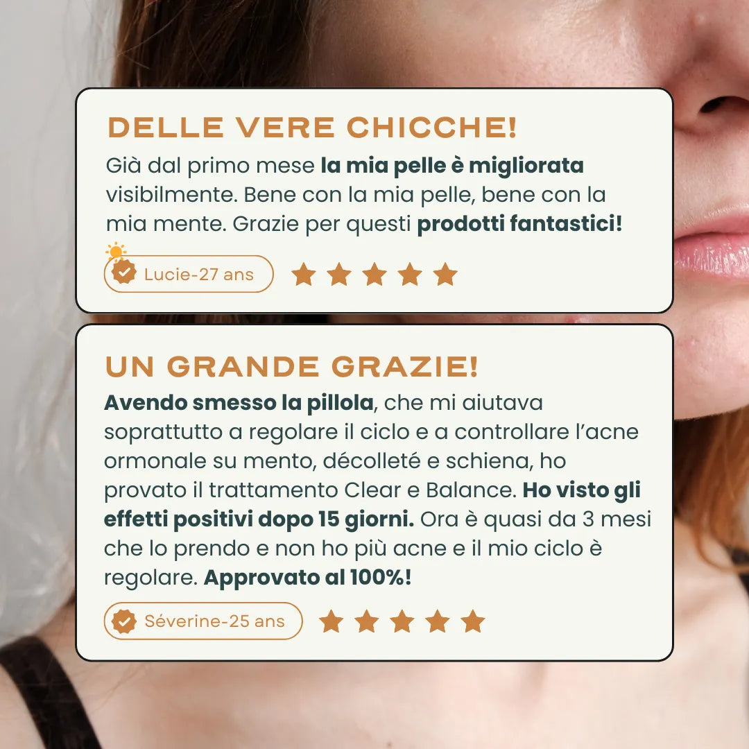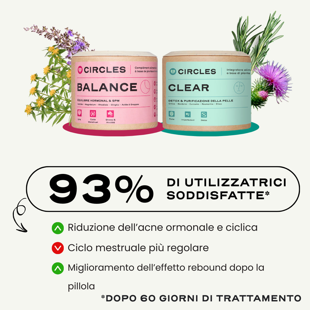 Il duo BALANCE e CLEAR è ideale per accompagnare la cessazione della contraccezione ormonale, per evitare un possibile “effetto rebound” ormonale e per favorire il ritorno dei cicli “naturali”. Gli ormoni sintetici somministrati dai contraccettivi ormonali hanno l'effetto di sovraccaricare il fegato, l'organo centrale dell'equilibrio ormonale. Questo a volte è accompagnato dall'acne. I principi attivi depurativi e antiossidanti di CLEAR sono stati studiati per supportare il lavoro del fegato nell'eliminazione delle tossine. Gli ingredienti del trattamento BALANCE contribuiscono alla regolazione dell'attività ormonale e sono stati studiati per favorire dolcemente il ritorno ai cicli “normali” e all'ovulazione. L'ideale è iniziare i trattamenti dopo la sospensione del contraccettivo ormonale, tuttavia il trattamento CLEAR può eventualmente essere iniziato prima della sospensione, per preparare l'organismo. Una volta interrotta l'assunzione del contraccettivo si può iniziare il trattamento BALANCE.