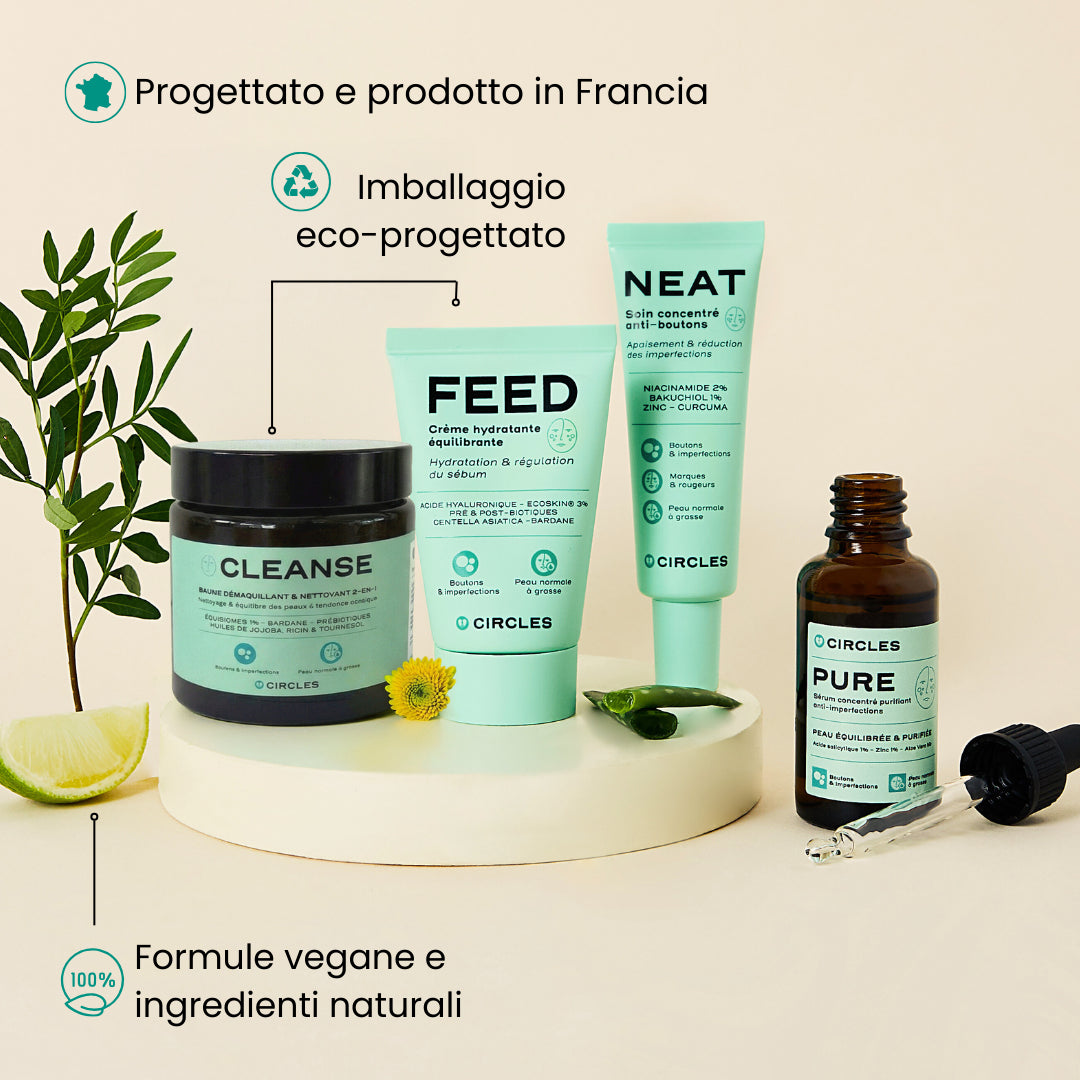 🌙 La sera: detergi il viso con CLEANSE, poi idrata la pelle con FEED. Termina con un sottile strato di NEAT, senza massaggiare, sulle zone che desideri trattare (pori dilatati, zone grasse, rossori, cicatrici, imperfezioni...) che puoi lasciare in posa tutta la notte.
