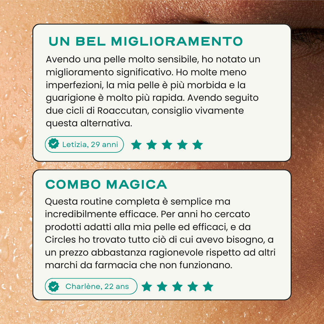 📅 Durata consigliata: la routine è stata studiata come trattamento quotidiano e di lunga durata per la pelle a tendenza acneica.