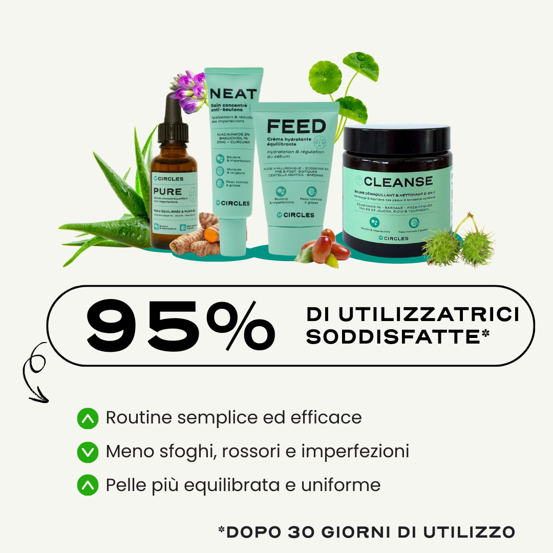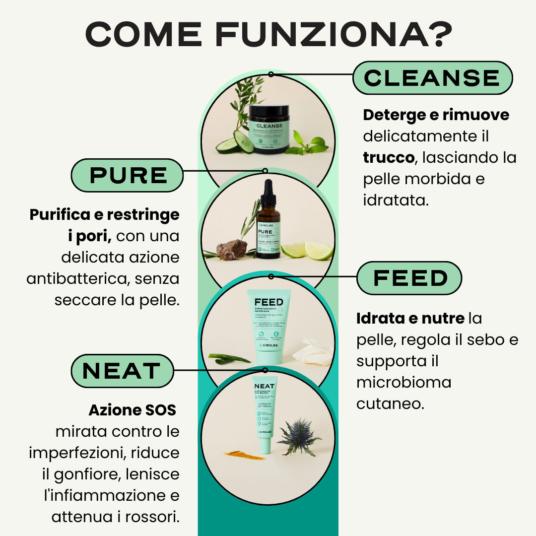 1x CLEANSE, 1x PURE, 1x FEED, 1x NEAT, che rappresentano 2-3 mesi di utilizzo