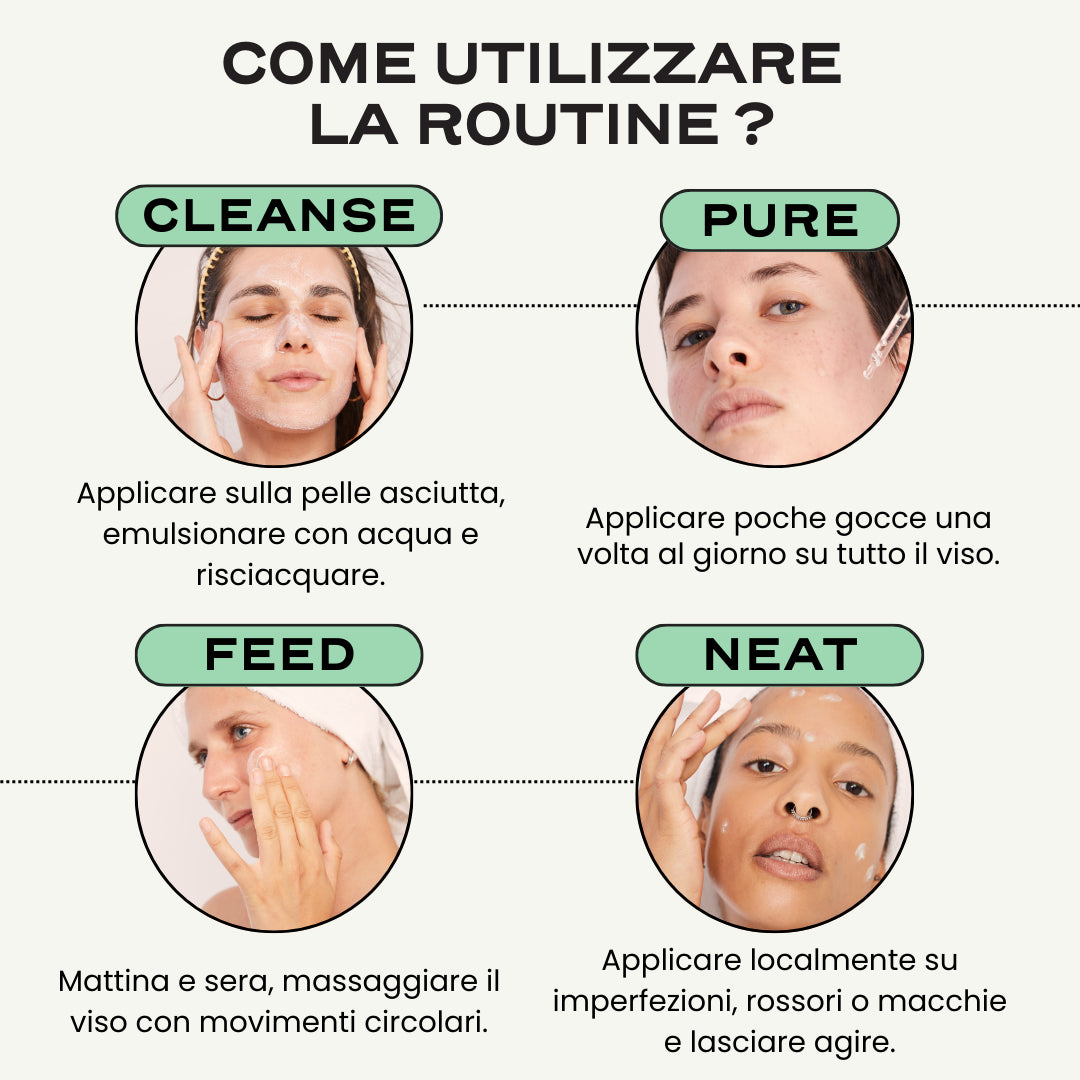 ☀️ Al mattino: dopo aver deterso il viso con acqua, applicare qualche goccia di PURE su tutto il viso, prima di idratare viso e collo con FEED. Applicare NEAT a piccoli tocchi dove necessario (imperfezioni, brufoli, cicatrici, rossori, ecc.), picchiettando delicatamente per favorire l'assorbimento del prodotto.