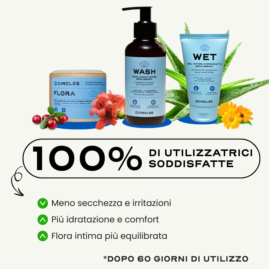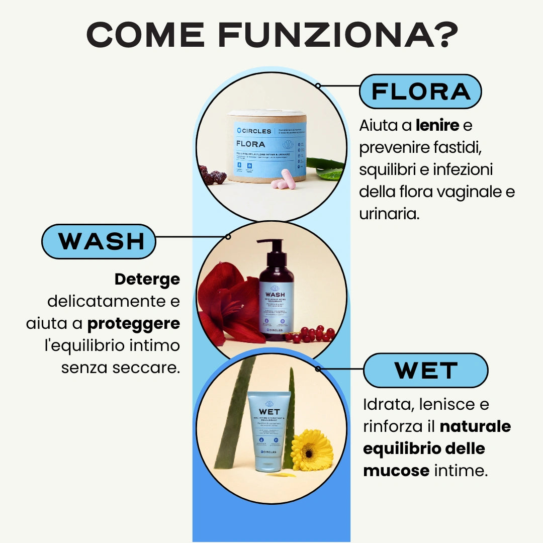 3 mesi: 💊💊💊 3x FLORA (1 mese) | 🧴 1x WASH (200 ml) | 💧 1x WET (60 ml)