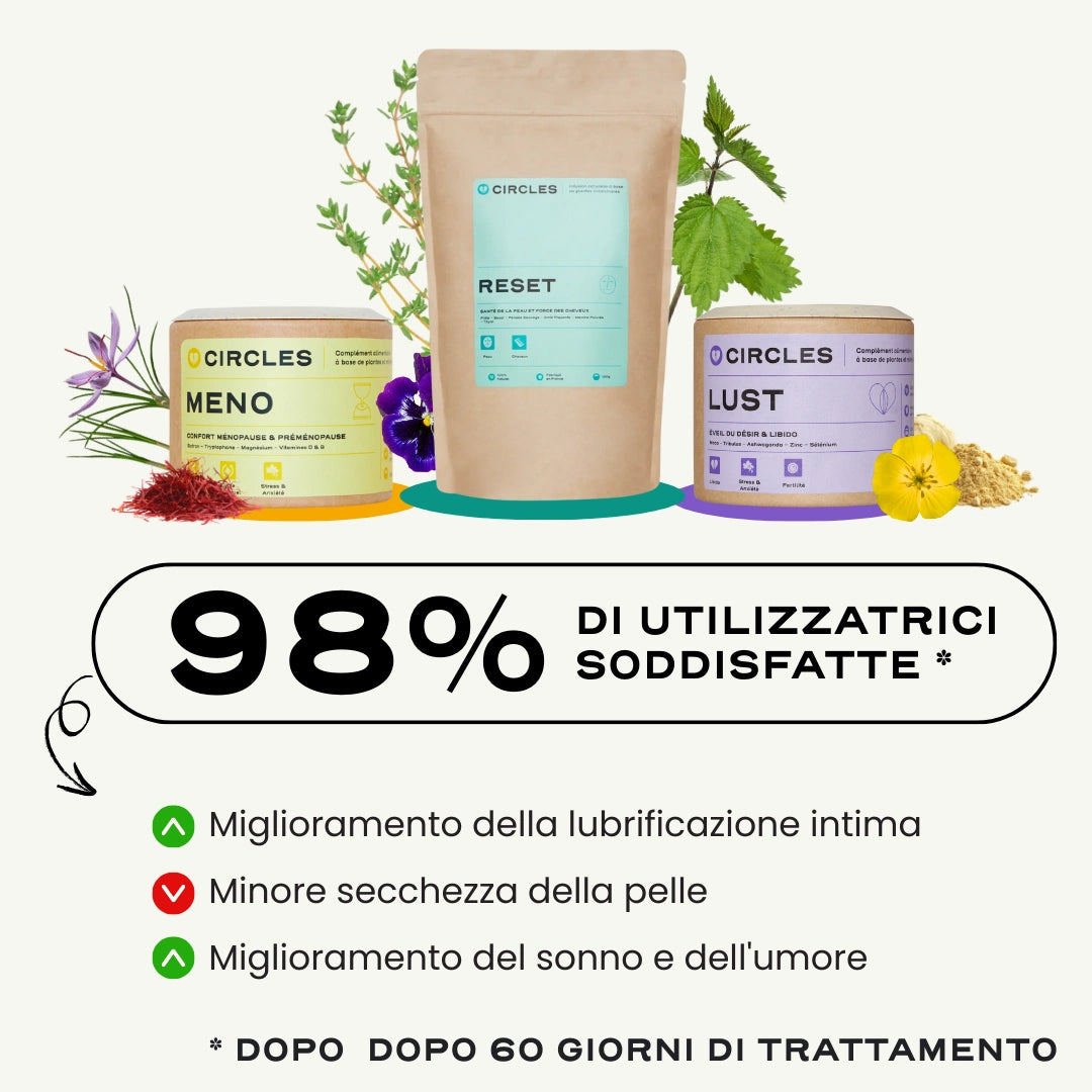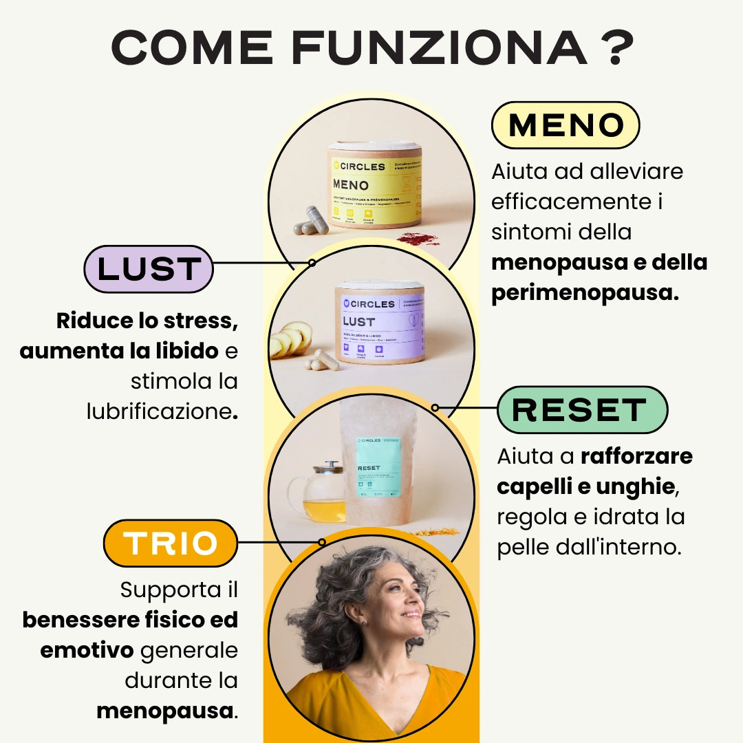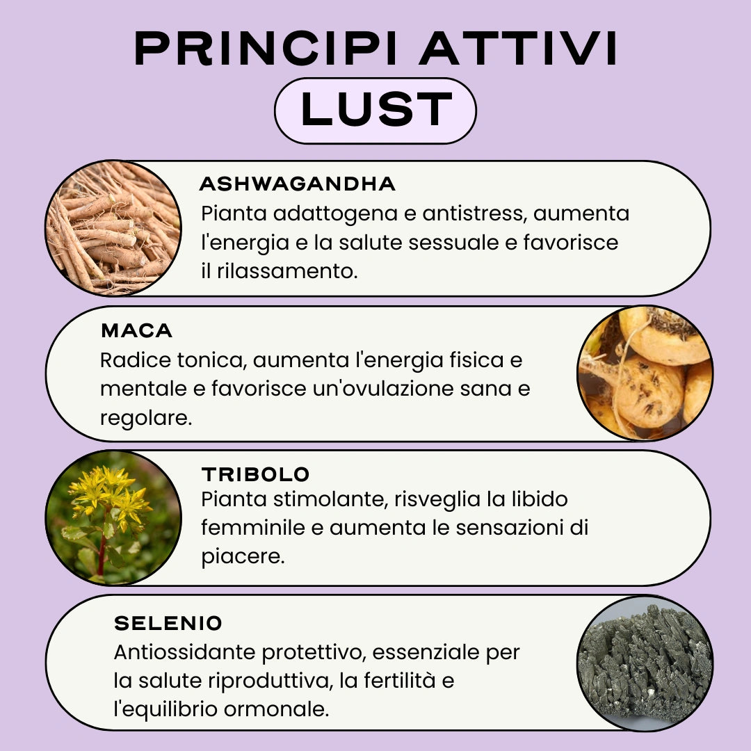 LUST è stato ideato per supportare le variazioni della libido e del desiderio, particolarmente presenti in prossimità della menopausa, agendo sulle cause: stanchezza mentale e fisica, stress e ansia, secchezza intima, calo della produzione ormonale... Il desiderio sessuale si risveglia, la libido si stabilizza, la nebbia mentale si dirada, ritornano le energie e le sensazioni di piacere rinascono. Un integratore alimentare ricco di piante officinali, minerali e vitamine dagli effetti scientificamente provati.