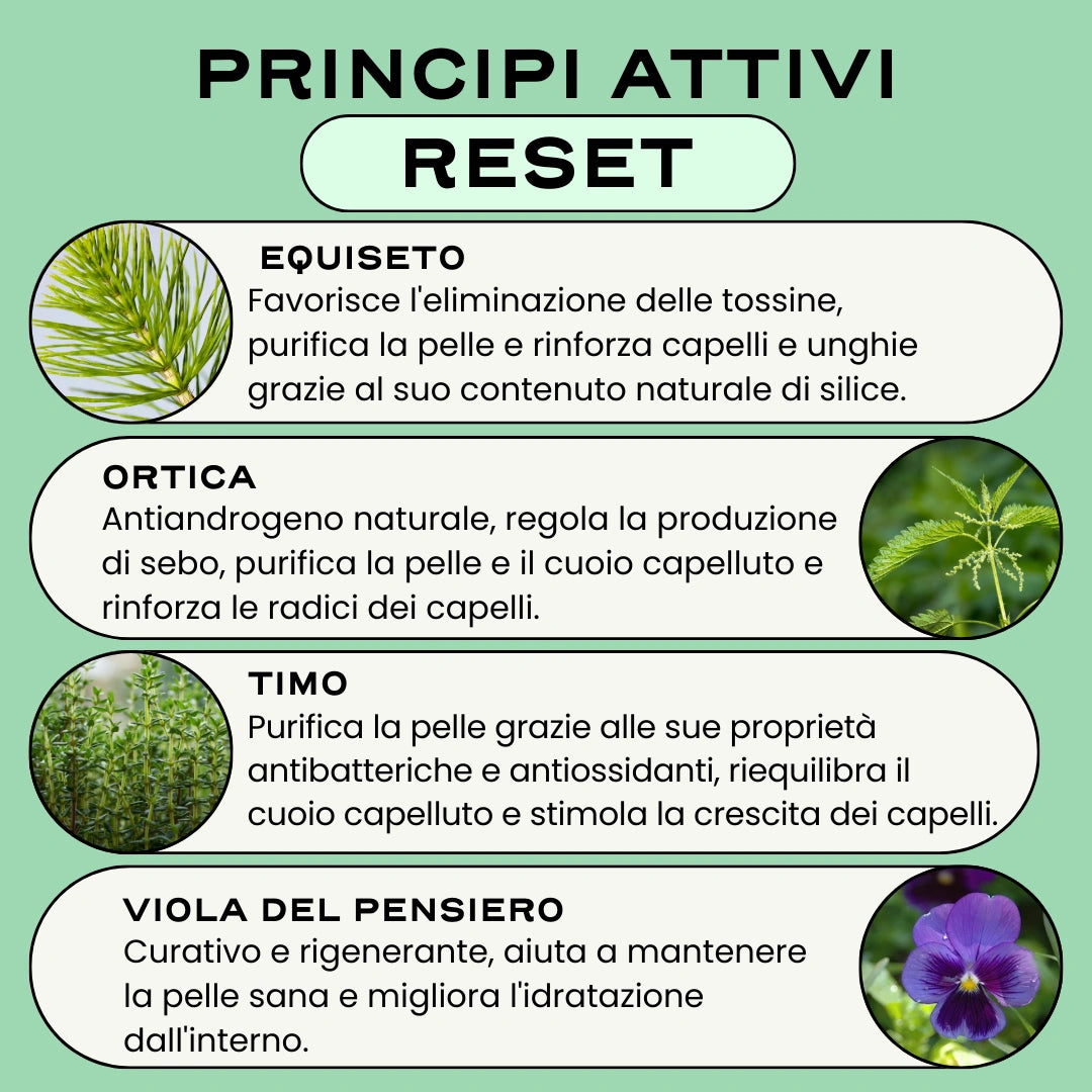 L'infuso RESET è un trattamento pelle & capelli a doppia azione, per una rigenerazione a tutti i livelli: le piante che lo compongono sono note per il loro effetto sulla produzione naturale di collagene e sono state scelte per le loro proprietà curative e antietà. Gli ingredienti sono stati studiati anche per le loro proprietà stimolanti e regolatrici del cuoio capelluto, per ripristinare la vitalità e la densità dei capelli e per combattere la caduta dei capelli.