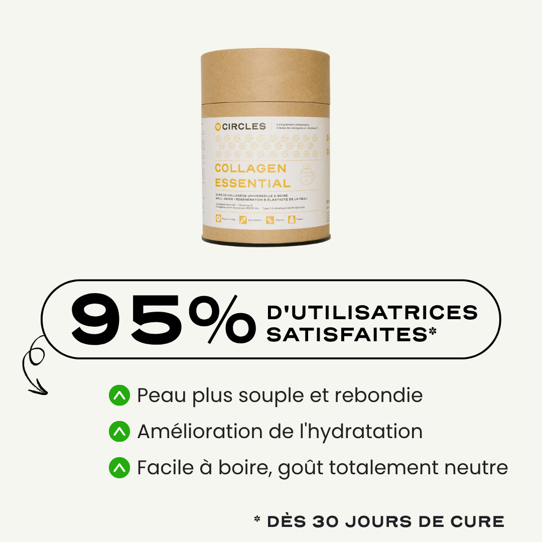 Le collagène est un élément constitutif essentiel de notre organisme, essentiel à la santé de la peau, des cheveux, des articulations, des ongles et de la digestion. À partir de 25 ans, la production de collagène baisse en moyenne de 1% par an, ce qui se traduit par une baisse de la fermeté et de l'élasticité de la peau, l'apparition de marques de l'âge et de rides, une peau plus fine et facilement déshydratée, ainsi que des cheveux et ongles cassants.