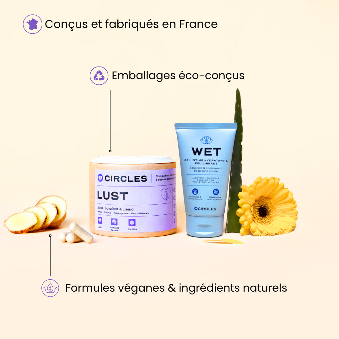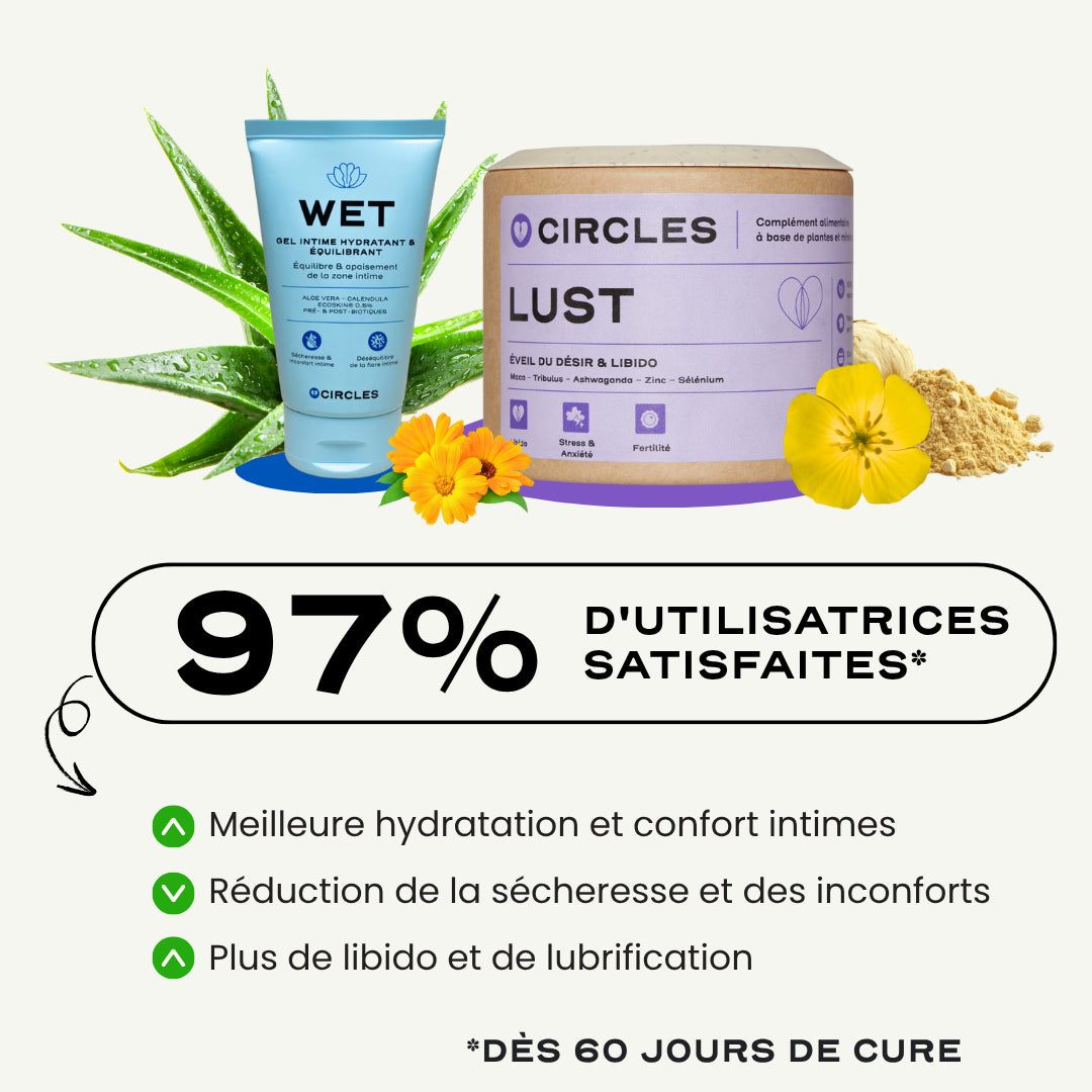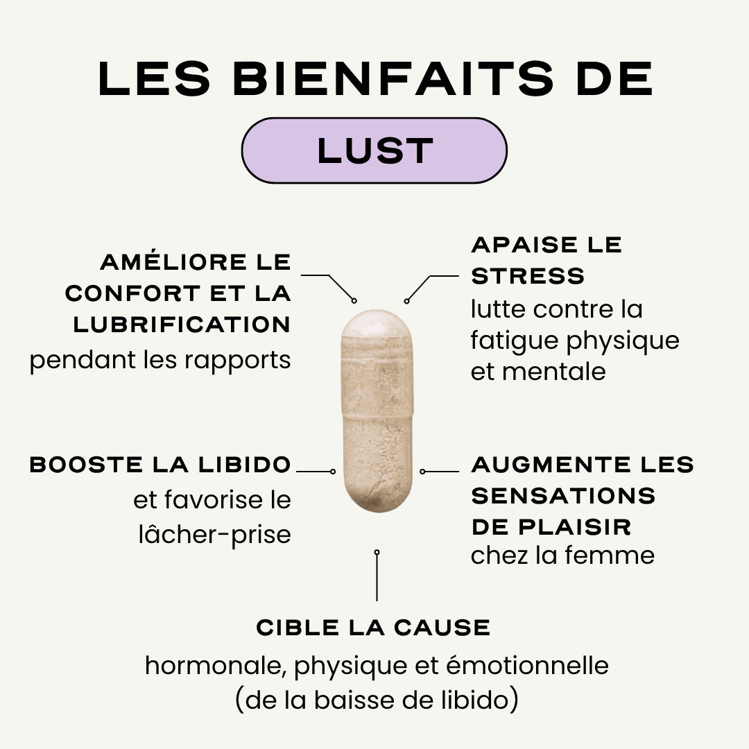 LUST : Notre cure dédiée à l'éveil du désir, du plaisir et au lâcher-prise. Une cure avec des plantes et des minéraux naturellement stimulants, choisis pour leur efficacité sur la réduction du stress et l'amélioration de l'énergie sexuelle féminine. Un esprit apaisé, une lubrification et des sensations de plaisir augmentées, pour une vie sexuelle et des rapports intimes améliorés.