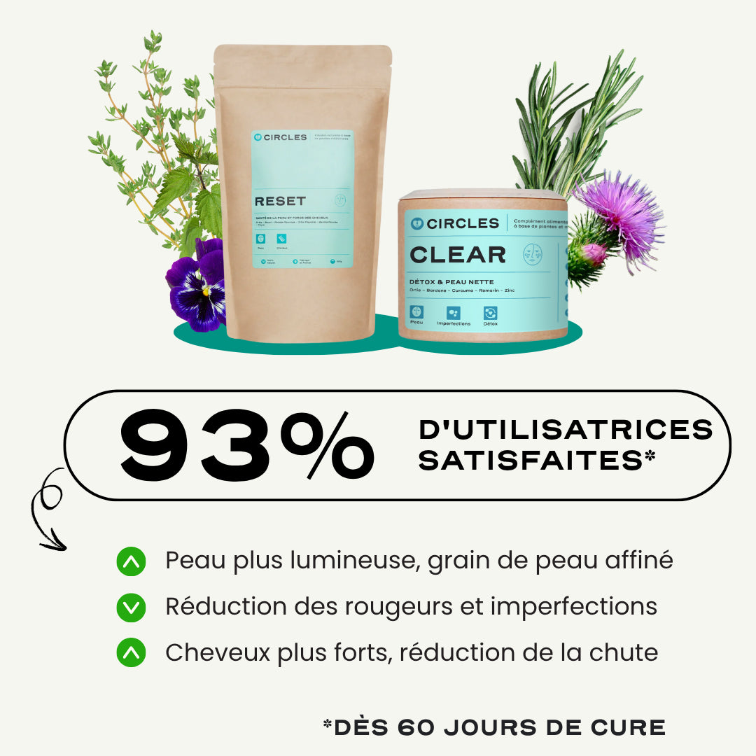 La combinaison de nos cures CLEAR et RESET pour soutenir la détox de l'organisme et favoriser l'équilibre et la santé de la peau et des cheveux.