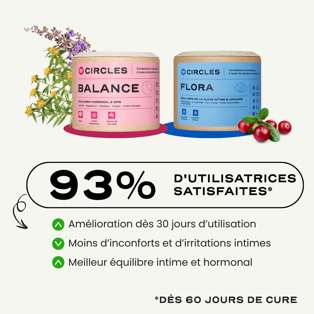 Deux cures pour une double action équilibrante et protectrice sur l'équilibre de la flore intime (vaginale et urinaire) ! BALANCE cible la cause hormonale des déséquilibres chroniques ou récurrents, tandis que FLORA contribue efficacement à prévenir la récidive des infections urinaires ou des mycoses vaginales grâce à sa formulation innovante comportant 6 (!) différentes souches de probiotiques aux bienfaits étudiés pour leur action anti-pathogènes et sur la santé de la flore intime. Les hormones et la flore intime sont équilibrées, le confort intime amélioré.