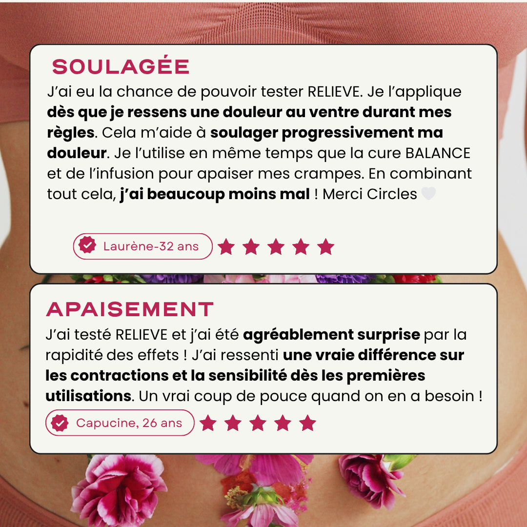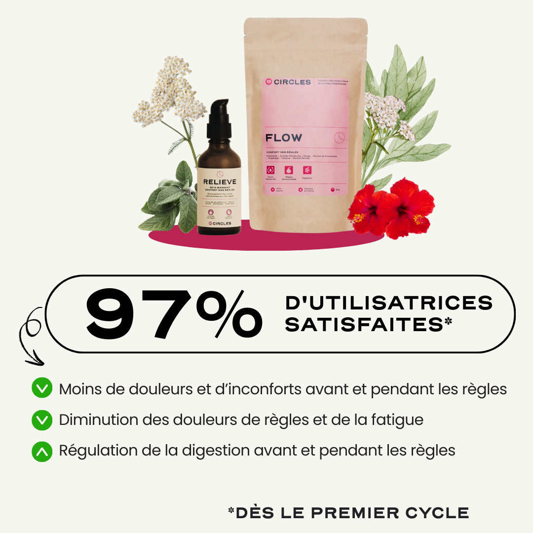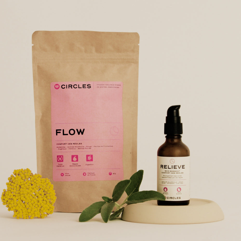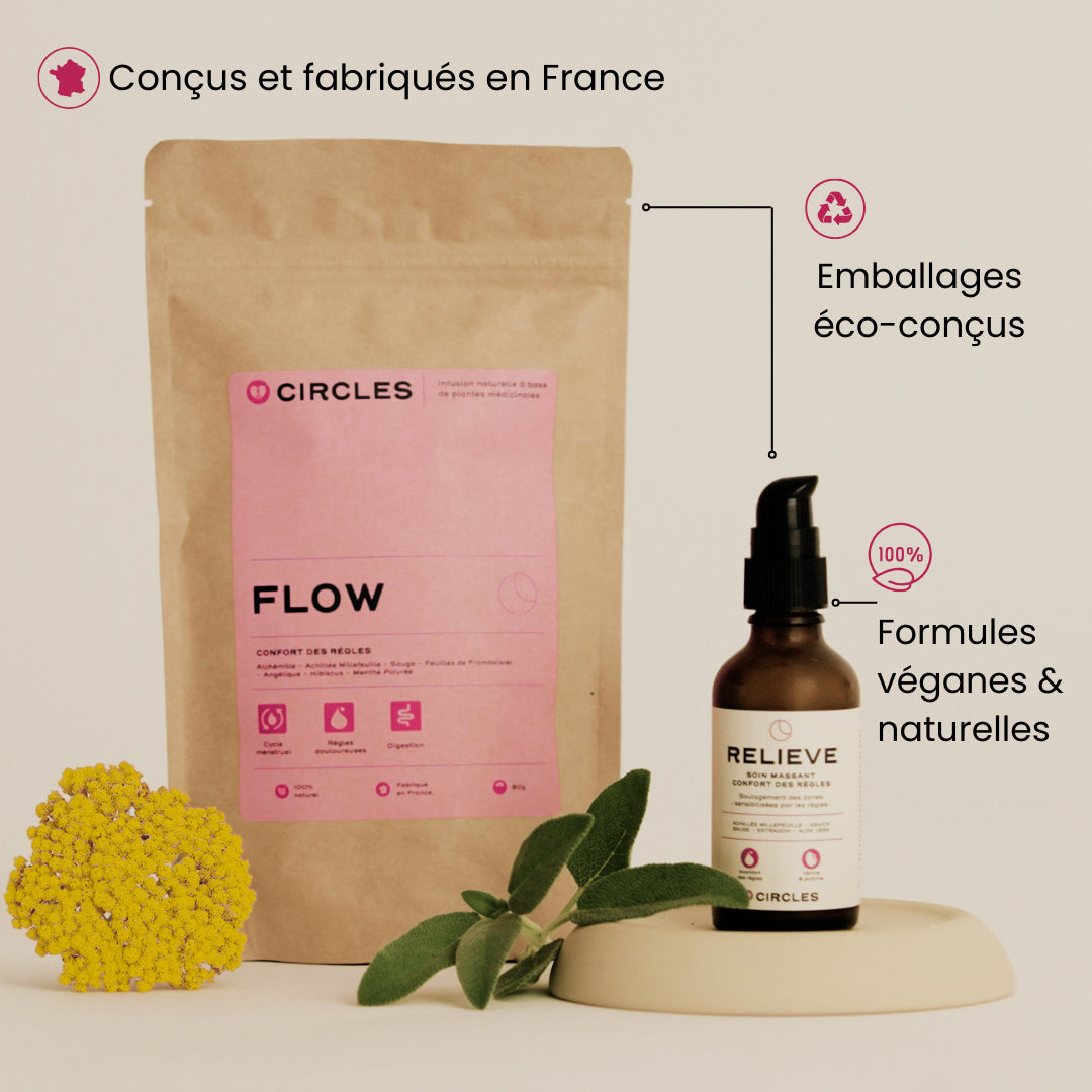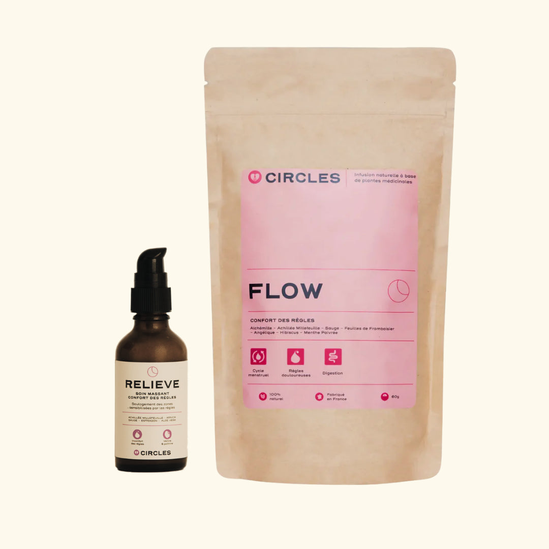 FLOW, notre infusion apaisante à base de 7 plantes médicinale, soutient le corps pendant les périodes de règles intenses : elle contribue à réduire l’inflammation, apaiser les troubles digestifs et les crampes, et soulager les douleurs de règles. RELIEVE, notre sérum apaisant innovant, agit localement sur le bas-ventre, le dos ou la poitrine pour détendre les muscles, relâcher les tensions et soulager rapidement les douleurs et les inconforts liés au cycle menstruel et aux règles.