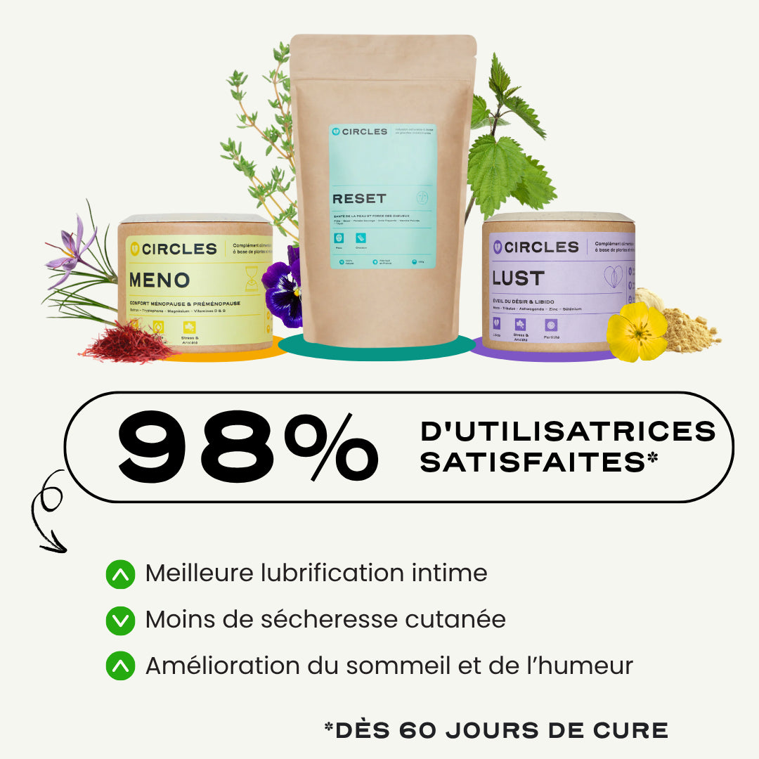 Le coffret d'essentiels pour accompagner l'arrivée de la ménopause et apporter une réponse complète et respectueuse des besoins de l'organisme en cette période si particulière de la vie féminine, grâce à l'action combinée de nos cures MENO, LUST et RESET.