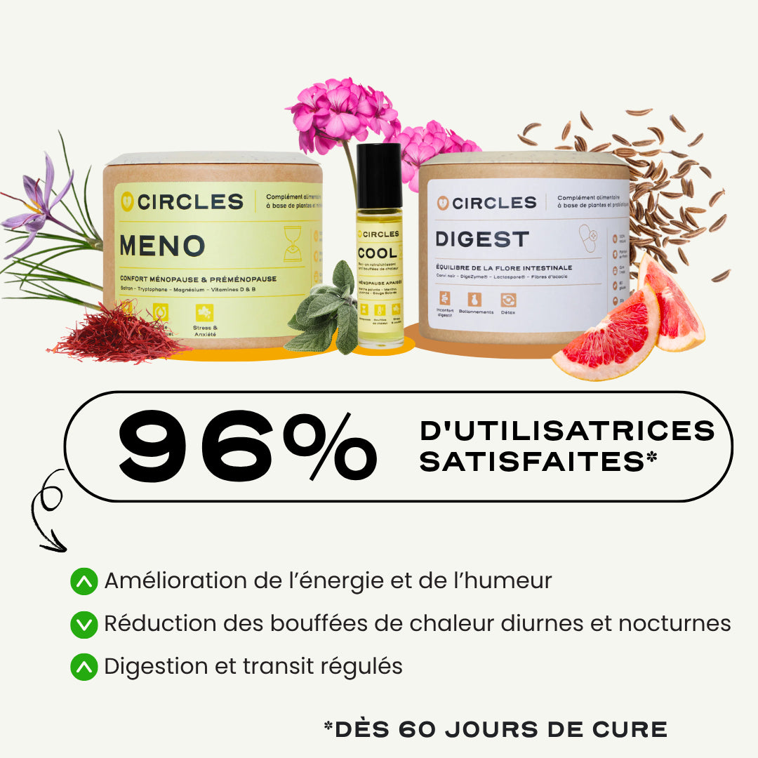 🧘♀️ MENO : notre cure best-seller pour préparer et accompagner une transition hormonale vers la ménopause sereine et apaisée, équilibrer naturellement l'humeur et favoriser un meilleur sommeil.